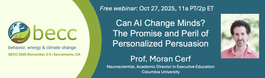 The BECC Webinar Series brings attention to cutting-edge advances in research and practice addressing behavior, energy, and climate change. We showcase the best BECC-related content and world leaders in the field to keep the conversation going between conferences and throughout the year. For those who cannot attend BECC, the sessions provide an opportunity to learn and share ideas. For those who can attend, the series gives a preview of conference topics. Our mission is to promote and disseminate behavior research as it applies to real-world climate and energy issues. Enjoy!