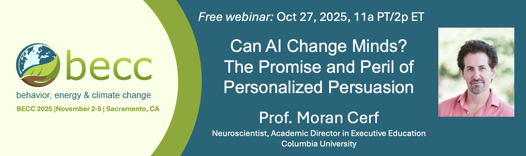 On Monday, Oct 27, from 11-12p PT (2-3p ET), Prof. Moran Cerf will share new findings from a recent Nature Scientific Reports study demonstrating how large language models (LLMs) can generate personalized persuasive messages at scale, revealing surprising implications for public communication, marketing, and behavior change.